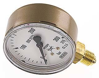 Housing: brass-coloured steel with pressure relief opening in the rear wall, measuring system and connection: Cu alloy, window: polycarbonate