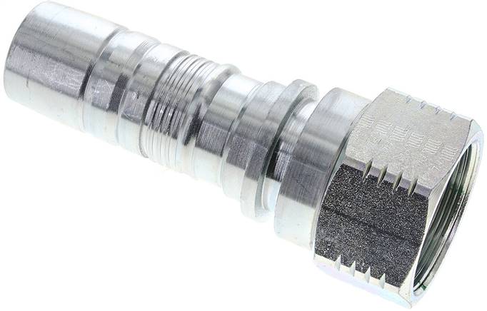 These crimped fittings with tear-off protection are developed specially for the 4 SH-hose. The 4 SH-hose should be skived not only externally but also internally. When compressing, a "metallic bond" is created between the fitting and the hose and this exposes the hose equipped with fittings to the maximum pressure load. The advantage of this combination is, amongst others, the use of a flexible 4-spiral hose or a 4-SH hose instead of a "rigid" 6-spiral hose.