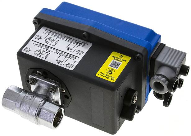 Elektrischer Schwenkantrieb mit optischer Stellungsanzeige, Handnotbetätigung und Schaltraumheizung. Zwei zusätzliche Endschalter für weitere Steuerungsaufgaben sind eingebaut. Eine elektronische Drehmomentbegrenzung verhindert Beschädigung bei Überlastung. Die Handnotbetätigung ist ohne Abbau der Verkleidung bedienbar. Nicht auf dem Kopf stehend einsetzen!