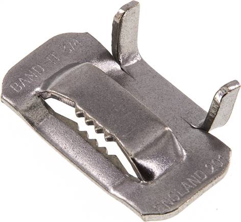 Pull the buckle with ears to the tape end on the tape. Form clamps and place tape on tape. Pull the buckle over both tapes and bend the tape end approx. 30 mm under the buckle. When there are high loads on the clamps (e.g. for hose assembly) pull the tape twice through the buckle.