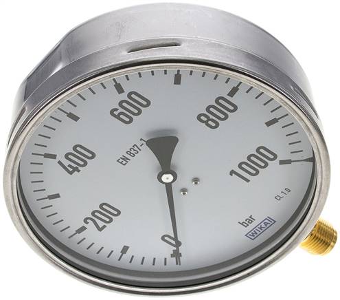 Housing: 1.4301, Measuring system: Cu-alloy (1.4404 for pressures >= 100 bar), connection: Brass, window: instrument plate glass