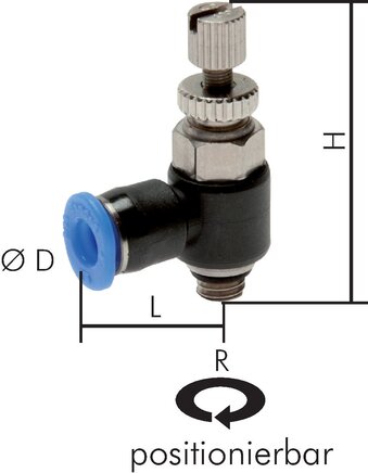 Exemplary representation: Mini throttle check valve (exhaust regulating) Exemplary representation: Mini throttle check valve (supply air regulating) Schematic symbol: Throttle check valve (exhaust regulating) Schematic symbol: Throttle check valve (supply air regulating)